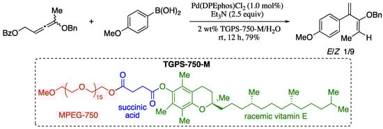 As the field of green chemistry continues to expand, a number of new technologies for improving the sustainability of transition metal-catalysed processes are becoming more and more popular. In particular, switching from an organic to an aqueous micellar medium is recognized as one of the most relevant new strategies in metal-catalysis [,]. Following this new trend, Lipshutz and co-workers reported an environmentally responsible methodology for the preparation of substituted 1,3-butadienes based on the palladium-catalysed cross-coupling of allenes and arylboronic acids under micellar reaction conditions (Scheme 5) [].