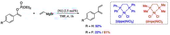 Fiorito et al. described two nickel(II) precatalysts which enable the Kumada cross-coupling between vinyl magnesium bromide and vinyl phosphates, providing 2-substituted 1,3-dienes in good yields and with high levels of stereocontrol []. The cross-coupling reaction between phenyl vinylphosphate and vinyl magnesium bromide in the presence of commercial precatalyst [(dppe)NiCl2] afforded 2-phenyl-1,3-diene in good yield (Scheme 7). For difficult substrates such as p-fluorophenyl vinylphosphate, complex [(dmpe)NiCl2] was used as a satisfactory alternative.