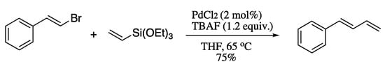 Although effective, both the Negishi and Kumada processes suffer from similar problems to the Suzuki-based methodologies, as they require air and moisture sensitive conditions and in situ preparation of the vinyl intermediate. The Hiyama coupling is not subjected to these limitations, as vinylsilanes are non-toxic, stable and readily accessible. However, the classical version of the Hiyama coupling was severely limited by the requirement of a strong activator for the transmetallation step. Chatterjee et al. circumvented this issue utilizing metal nanoparticles as efficient catalysts in the presence of a mild activator such as tetrabutylammonium fluoride (TBAF) []. In a typical experimental procedure, styryl bromide was coupled with triethoxyvinylsilane in the presence of palladium(II) chloride and TBAF to produce the corresponding (E)-1,3-diene in good yields and total stereoselection (Scheme 8). The use of TBAF has a double function, as it stabilizes the Pd nanoparticles and also activates the siloxane.