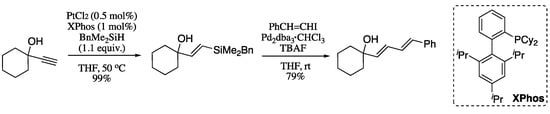 Analogously to the Suzuki, Kumada and Negishi reactions, dienes can also be prepared from alkynes by the means of a hydrosilylation–Hiyama sequence. McAdam and co-workers developed an hydrosilylation methodology to form vinylsilanes from propargylic alcohols using commercially available benzyldimethylsilane; the resulting vinylsilanes are very stable and can undergo simple activation with TBAF under Trost-type conditions [,]. Subsequently, these authors developed a methodology for the formation of highly functionalised 1,3-dienes based on the hydrosilylation–Hiyama protocol (Scheme 9) []. Thus, hydrosilylation of 1-ethynylcyclohexan-1-ol afforded the corresponding vinylsilane in excellent yield and total E selectivity. Subsequent Hiyama coupling with iodostyrene afforded the corresponding (E,E)-diene in good yields and with total selectivity.