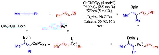 1-Boron-1,3-dienes are important building blocks in the synthesis of a broad range of bioactive natural products and organic intermediates. In 2018, Fañanás-Mastral reported notable contribution to the stereoselective synthesis of syn-borylated 1,3-dienes by Cu/Pd-catalysed alkenylboration of alkynes with alkenyl bromides and bis(pinacolato)diboron []. This methodology involved a Cu-catalysed carboboration of alkynes to provide β-boryl-substituted alkenylcopper intermediates, which on subsequent stereoretentive Pd-catalysed cross-coupling with alkenyl halides afforded the desired syn-borylated 1,3-dienes (Scheme 10).