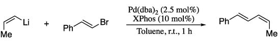 As seen throughout this section, organozinc, organotin, and organoboron compounds that are employed in vinyl-vinyl cross-coupling reactions, are frequently prepared from the corresponding organolithium compounds by transmetalation. Notwithstanding the evident synthetic interest, the direct cross-coupling of organolithium reagents remained virtually unexplored until very recently, due to limitations such as high reactivity and low selectivity. This has changed with Feringa’s studies on the palladium-catalysed cross-coupling of organolithium nucleophiles and organic halides [,,,]. In order to take advantage of this interesting protocol for the synthesis of 1,3-dienes, the direct cross-coupling of alkenyllithium reagents with alkenyl halides was also described (Scheme 11) [].