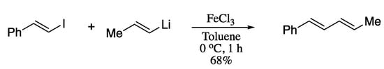 Following Feringa’s pioneering work on palladium-catalysed cross-coupling of alkenyllithium reagents, Liu and co-workers reported in 2018 a ligand-free iron-catalysed cross-coupling reaction of alkenyllithium compounds and vinyl iodides to form conjugated (E,E)-diene in good yields with full retention of stereochemistry (Scheme 12) [].