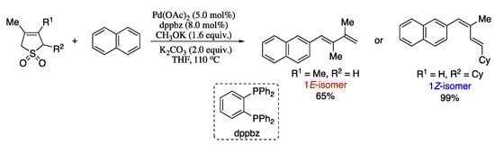 As stated before, 1,3-dienes are typically constructed by linkage of two C=C units. However, direct attachment of the 1,3-diene moiety would allow for a more convergent and efficient strategy. Notwithstanding the evident advantages, the development of this methodology has been hampered by the lack of stable and readily available dienylation reagents. Dienylboronic acids have been explored for dienylation, but they are unstable and difficult to prepare []. In the search for more effective dienylation agents, Nguyen and co-workers developed a simple and practical, regio- and stereoselective dienylation employing readily available sulfolenes (Scheme 15). The regio- and stereo- selectivity are determined by the substitution pattern in the starting sulfolenes. Thus, the reaction is E-selective for 3,4-dimethyl sulfolene, whereas the Z-selective dienylation is observed for 2-cyclohexyl-4-methyl sulfolene.