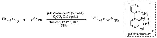The recent investigations aimed at overcoming the limitations of the Heck vinylation reaction for the construction of the 1,3-diene moiety were focused not only in the discovery of new coupling partners, but also in the development of novel catalyst systems. For example, Xu et al. developed a convenient methodology for the Heck reaction of alkenes and β-bromostyrenes based on the use of a μ-OMs palladium–dimer complex as promotor []. μ-OMs dimer is a non-phosphorus Pd-precatalyst which was developed by Buchwald for C–N/C–C coupling reactions []. When applied to the Heck reaction of (E)-(2-bromovinyl)benzene and styrene, the corresponding (1E,3E)-1,4-diphenylbuta-1,3-diene was isolated in good yield with total stereoselectivity (Scheme 18). It is widely assumed that the regioselectivity of the Heck vinylation reaction is substrate-controlled. Electron-deficient alkenes, such as acrylates and styrenes, afford linear dienes [,,,] whereas electron-rich alkenes, such as vinyl amides, furnish branched dienes [,].