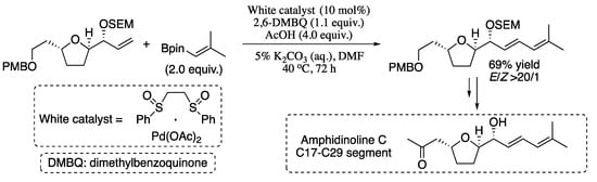 In 2013, Delcamp et al. reported an oxidative Heck vinylation for the formation of dienes and polyenes []. In this methodology, the reaction of limiting quantities of non-stabilized terminal olefins and slight excesses of vinyl boronic esters proceeds via oxidative Pd(II)/sulfoxide catalysis to afford 1,3-dienes in good yields and excellent stereoselectivities. The potential of this powerful cross-coupling reaction in the synthesis of medicinally relevant complex diene targets was also explored. As a representative example, the synthesis of the amphidinolide C C17−C29 segment is presented in Scheme 20.