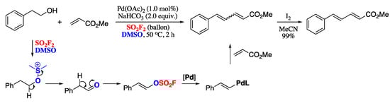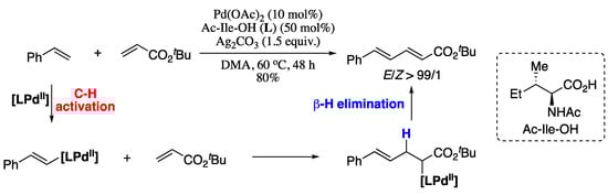 Among them, the most popular is the Heck vinylation reaction [], which enables direct formation of dienes from an activated coupling partner and a vinylic C−H bond of a terminal olefin substrate [,]. Depending on the activated coupling partner, there are two main types of Heck vinylation reactions: the Mirozoki-Heck reaction of alkenes and vinyl halides and the oxidative Heck reaction of alkenes and vinylboronic acids.