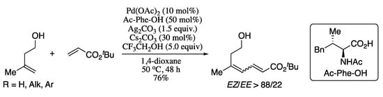 Despite their evident synthetic potential, the classical methods for Heck vinylation has had limited application in the preparation on biologically relevant 1,3-dienes because the scope is often limited to resonance activated olefins (e.g., α,β-unsaturated carbonyls and stryenes) and also because Pd−H isomerization usually results in moderate stereoselectivity [,,]. However, the past few years have witnessed important advances in the Heck vinylation reaction, that resulted in a renewed interest in the application of this methodology to the stereoselective synthesis of 1,3-dienes [].