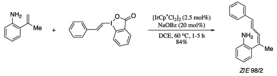 - Boelke, A.; Caspers, L.D.; Nachtsheim, B.J. NH2-directed C−H alkenylation of 2-vinylanilines with vinylbenziodoxolones. Org. Lett. 2017, 19, 5344–5347. [Google Scholar] [CrossRef]