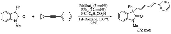 - Lu, C.-J.; Yu, X.; Wang, H.; Chen, Y.-T.; Song, Q.-B.; Yang, Z.-P.; Wang, H. Palladium-catalyzed allylation of cyclopropyl acetylenes with oxindoles to construct 1,3-dienes. Eur. J. Org. Chem. 2020, 680–688. [Google Scholar] [CrossRef]