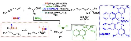 - Su, Y.-L.; Li, L.-L.; Zhou, X.-L.; Dai, Z.-Y.; Wang, P.-S.; Gong, L.-Z. Asymmetric α-allylation of aldehydes with alkynes by integrating chiral hydridopalladium and enamine catalysis. Org. Lett. 2018, 20, 2403–2406. [Google Scholar] [CrossRef]
