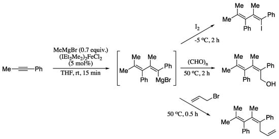 - Liu, Y.; Wang, L.; Deng, L. Selective double carbomagnesiation of internal alkynes catalyzed by iron-N-heterocyclic carbene complexes: A convenient method to highly substituted 1,3-dienyl magnesium reagents. J. Am. Chem. Soc. 2016, 138, 112–115. [Google Scholar] [CrossRef]