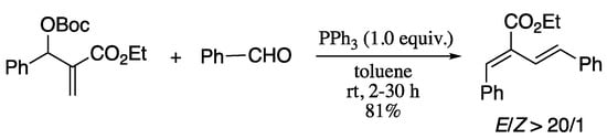 - Xu, S.; Zhou, L.; Zeng, S.; Ma, R.; Wang, Z.; He, Z. Phosphine-mediated olefination between aldehydes and allenes: An efficient synthesis of trisubstituted 1,3-dienes with high E-selectivity. Org. Lett. 2009, 11, 3498–3501. [Google Scholar] [CrossRef]