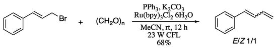 - Jiang, M.; Yang, H.; Lefebvre, Q.; Su, J.; Fu, H. Olefination of alkyl halides with aldehydes by merging visible-light photoredox catalysis and organophosphorus chemistry. iScience 2018, 6, 102–113. [Google Scholar] [CrossRef] [PubMed]