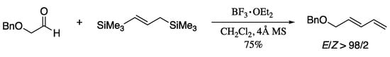 - Borg, T.; Tuzina, P.; Somfai, P. Lewis acid-promoted addition of 1,3-bis(silyl)propenes to aldehydes: A route to 1,3-dienes. J. Org. Chem. 2011, 76, 8070–8075. [Google Scholar] [CrossRef] [PubMed]