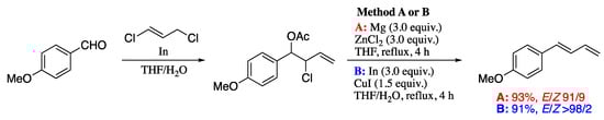 - González-Rodríguez, J.; Soengas, R.G.; Rodríguez-Solla, H. Cooperative zinc/catalytic indium system for the stereoselective sequential synthesis of (E)-1,3-dienes from carbonyl compounds. Org. Chem. Front. 2021, in press. [Google Scholar] [CrossRef]