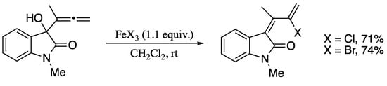 - Alcaide, B.; Almendros, P.; Luna, A.; Prieto, N. Direct FeX3-based stereocontrolled access to (Z)-3-alkenyl-oxindoles from allenols. J. Org. Chem. 2012, 77, 11388–11392. [Google Scholar] [CrossRef] [PubMed]