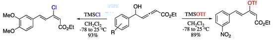 - Crouch, I.T.; Dreier, T.; Frantz, D.E. Palladium-catalyzed elimination/isomerization of enol triflates into 1,3-dienes. Angew. Chem. Int. Ed. 2011, 50, 6128–6132. [Google Scholar] [CrossRef]