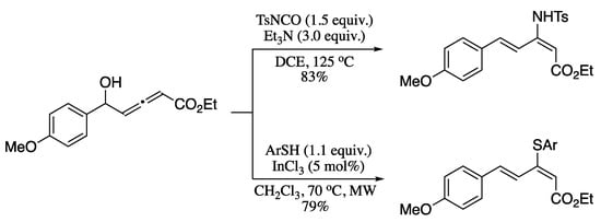 - Wu, L.; Huang, H.; Liang, Y.; Cheng, P. Regio- and stereoselective synthesis of 2-amino-dienes via decarboxylative amination of 4-(ethoxycarbonyl)-2,3-allenols by TsNCO. J. Org. Chem. 2014, 79, 11264–11269. [Google Scholar] [CrossRef]