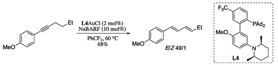 - Wang, Z.; Wang, Y.; Zhang, L. Soft propargylic deprotonation: Designed ligand enables Au-catalyzed isomerization of alkynes to 1,3-dienes. J. Am. Chem. Soc. 2014, 136, 8887–8890. [Google Scholar] [CrossRef]