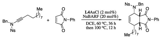 - Ting, C.-M.; Hsu, Y.-L.; Liu, R.-S. Gold-catalyzed isomerization of unactivated allenes into 1,3-dienes under ambient conditions. Chem. Commun. 2012, 48, 6577–6579. [Google Scholar] [CrossRef]