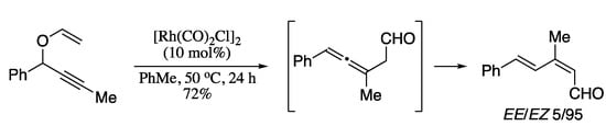 - Vidhani, D.V.; Krafft, M.E.; Alabugin, I.V. Stereocontrolled synthesis of (E,Z)-dienals via tandem Rh(I)-catalyzed rearrangement of propargyl vinyl ethers. Org. Lett. 2013, 15, 4463–4465. [Google Scholar] [CrossRef]