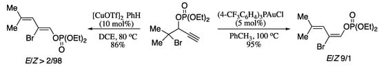 - Shiroodi, R.K.; Dudnik, A.S.; Gevorgyan, V. Stereocontrolled 1,3-phosphatyloxy and 1,3-halogen migration relay toward highly functionalized 1,3-dienes. J. Am. Chem. Soc. 2012, 134, 6928–6931. [Google Scholar] [CrossRef][Green Version]