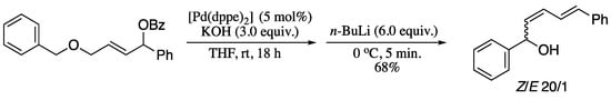 - Nakano, T.; Soeta, T.; Endo, K.; Inomata, K.; Ukaji, Y. Stereoselective synthesis of (2Z,4E)-2,4-pentadien-1-ols via sequential 1,4-elimination reaction and [1,2]-Wittig rearrangement starting from (E)-4-alkoxy-2-butenyl benzoates. J. Org. Chem. 2013, 78, 12654–12661. [Google Scholar] [CrossRef][Green Version]