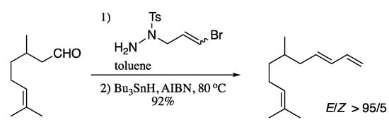 - Billard, F.; Robiette, R.; Pospíšil, P. Julia–Kocienski reaction-based 1,3-diene synthesis: Aldehyde-dependent (E,E/E,Z)-selectivity. J. Org. Chem. 2012, 77, 6358–6364. [Google Scholar] [CrossRef] [PubMed]