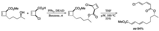 - Souris, C.; Misale, A.; Chen, Y.; Luparia, M.; Maulide, N. From stereodefined cyclobutenes to dienes: Total syntheses of Ieodomycin D and the southern fragment of Macrolactin A. Org. Lett. 2015, 17, 4486–4489. [Google Scholar] [CrossRef]