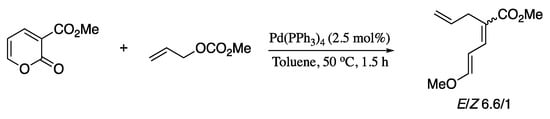 - Maji, T.; Tunge, J.A. Palladium-catalyzed double-decarboxylative addition to pyrones: Synthesis of conjugated dienoic esters. Org. Lett. 2015, 17, 4766–4769. [Google Scholar] [CrossRef]