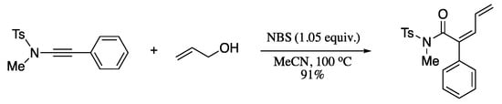 - Ding, R.; Li, Y.; Tao, C.; Cheng, B.; Zhai, H. Stereoselective synthesis of (2Z)-2,4-dienamides via NBS-mediated allyloxyl addition—Claisen rearrangement—dehydrobromination cascade reaction of ynsulfonamides. Org. Lett. 2015, 17, 3994–3997. [Google Scholar] [CrossRef]
