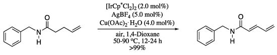 - Wang, Z.; He, Z.; Zhang, L.; Huang, Y. Iridium-catalyzed aerobic α,β-dehydrogenation of γ,δ-unsaturated amides and acids: Activation of both α- and β-C—H bonds through an allyl–iridium intermediate. J. Am. Chem. Soc. 2018, 140, 735–740. [Google Scholar] [CrossRef]