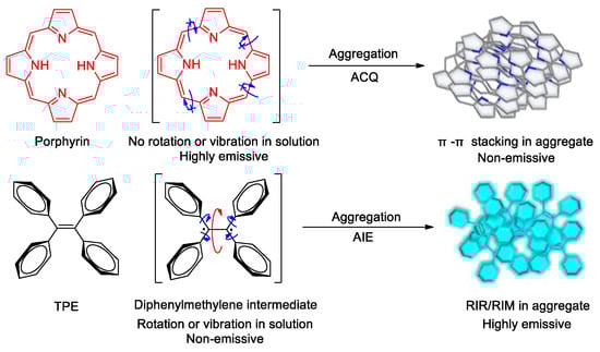 Porphyrins and phthalocyanines are the most widely studied PSs with fast intersystem crossing and long triplet lifetime and have already been applied in clinical applications [7,8]. Nevertheless, these PSs usually aggregate in aqueous media due to their low water solubility. This leads to low fluorescent intensity and PDT efficiency owing to the aggregation-caused quenching (ACQ) effect (Figure 1), which makes image-guided PDT difficult to achieve [9,10,11]. To solve this problem, some water-soluble and nonaggregating PSs have been synthesized [12]. However, such an approach greatly increased the cost of material preparation [13]. So, it is of great importance and is meaningful to develop novel PSs with outstanding fluorescent property in aqueous environments.