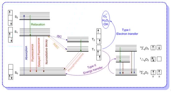 Absorption of a photon leads to the formation of an “excited state” of the photosensitizing agent. As illustrated in Figure 2, the common features of the electronic excitation and the consequent photochemical reactions may be described by three electronic states: singlet ground state (S0), singlet excited states (S1, S2), and longer-lived triplet excited state (T1).