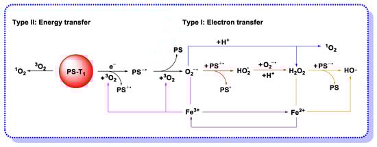 In view of the possible electron transfer from the PS in triplet excited state, the mechanism of hydroxyl radical generation through photocatalysis is proposed and presented in Figure 3. Although H2O2 is a worse electron acceptor than molecular oxygen, electron transfer reaction from PS* to H2O2 may occur if the PS triplet state lifetime is long enough [34]. Under the biological conditions with ferrous ions, H2O2 can undergo the Fenton reaction and produce hydroxyl radicals by one-electron reduction, meanwhile, the produced ferric iron can be reduced back to the ferrous state by superoxide for further use, which is termed the iron-catalyzed Haber–Weiss reaction [35]. On the other hand, H2O2 can react with the sensitizer radical anion to form hydroxyl radicals and hydroxide anion. The results of the completed and ongoing projects show that PDT is more effective if mechanism I is operative and completed with the generation of highly reactive hydroxyl radicals [36,37,38].
