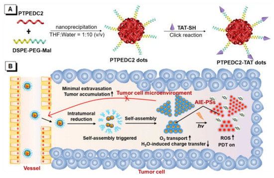 In recent years, many AIE–PS nanoparticles (NPs) have been designed based on the same strategy [52,53]. Moreover, by connecting thiophene ring or benzothiophene ring between the donor and the acceptor structure, AIE–PS with red-shifted emission and better performance can be obtained [66,67]. Wang reported a metal–organic framework (ZIF-8, ZIF = zeolitic imidazolate framework) by AIE–PS 8 assisted in vivo self-assembly nanoplatform, ZIF-8-PMMA-S-S-mPEG (nanoparticle 8), as an effective tool for organic PS payload to achieve efficient PDT [53]. As shown in Figure 6B, when nanoparticle 8 went through the vessel and entered the tumor tissue owing to the suitable size (about 50 nm), the mPEG chain would cleave under the effect of the disulfide bonds in the tumor, trigger the self-assembly of PS@ZIF-8-PMMA with the AIE-NPs nearby, and promote the retention of AIE–PSs in the tumor significantly because of their relatively large size of 200 nm. When O2 was delivered to AIE–PSs, 1O2 could be produced and maintain in the tumor for a long time. This strategy achieved the largest intratumoral 1O2 photosensitization of organic PS loaded with organic PS under light activation. It was proved to be advantageous for organic PSs typically suffering from moderate tumor accumulation and compromised intratumoral ROS generation.