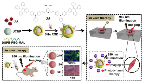 Connecting TPE to the atypical AIE (donor)-acceptor structure is also a typical method to construct the near-infrared AIE–PSs. For example, Tang and his team used amphiphilic polymers (i.e., DSPE-PEG2000 and DSPE-PEG2000-MAL) to encapsulate the hydrophobic upconversion nanoparticles (UCNPs) and AIE–PSs 25 (Figure 8) [70]. With high photostability, the prepared UCNP@25-cRGD NPs could maintain their fluorescent intensity above 70% after 30 days, and under NIR light illumination, a significant amount of ROS could still be detected even when covered within a 6 mm tissue. The UCNP@25-CRGD NPs could specifically target αvβ3 integrin over-expressed MDA-MB-231 cells and selectively kill these cells in both 2D and 3D cancer models upon NIR light illumination, without obvious dark cytotoxicity. The results of in vivo antitumor evaluation demonstrated that with NIR light illumination, the intravenously injected UCNP@25-cRGD NPs could light up the tumors and significantly induce apoptosis of tumor cells, and thus inhibit the growth of large tumors in a mouse model compared to white light illumination.