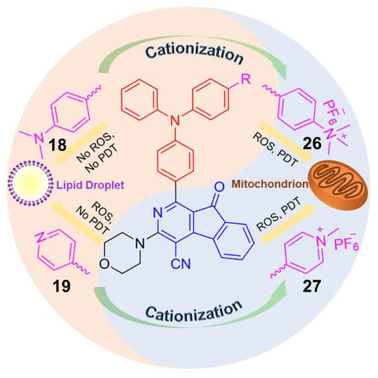 Another kind of most widely used core for the preparation of AIE–PSs is triphenylamine and its analogues. Triphenylamine is not only the core of AIE–PSs but also a typical electron donor, so this type of photosensitizers is called “AIE (Donor)-Acceptor PSs”. As reported, triphenylamine moiety has been widely used to enhance the AIE effect of the PSs and pyridinium group is proved to be a specific targeting site toward mitochondria [55,68,69]. The two kinds of moiety are bridged through different units such as phenyl and thiophene groups to regulate the molecular electron effect. As shown in Table 1 (AIE–PSs 9–19), most of the AIE (donor)-acceptor AIE–PSs are constructed in this way and exhibit good performance [42,56,58,59]. For instance, 10 and 12, respectively, showed strong AIE with the emission enhancement up to 290-fold and 34-fold, large two-photon absorption cross-section up to 477 and 303 GM, respectively, and highly specific targeting to mitochondria in living cells with good biocompatibility [55]. When 10 and 12 were excited at 405 nm, they could emit a light peak at about 800 nm, and produce ROS as well. Therefore, they showed great potential in the clinical application of cell/tissue bioimaging by two-photon fluorescence as well as the image-oriented and mitochondrial photodynamic cancer therapy.