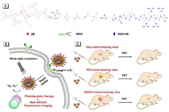 (A) Chemical structures of AIE–PS 28, 1,2-distearoyl-sn-glycero-3-phosphoethanolamine -N-[maleimide(polyethylene glycol)-2000] (MPD), and RGD-4R. (B) Cellular uptake and PDT process of RGD-4R-MPD/28 NPs. (C) Xenograft tumor models of cervical, prostate, and ovarian cancers are established with HeLa, PC3, and SKOV-3 cells, respectively. Adapted and modified with permission from reference 71 (copyright 2020, American Chemical Society).
