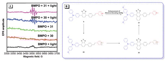 (A) EPR signals of BMPO for free radical ROS characterization. Adapted and modified with permission from reference 54 (copyright 2020, Wiley-VCH). (B) Chemical structures of AIE–PSs 9, 29–31 (the donor and acceptor groups are represented by the blue and red scheme, respectively).