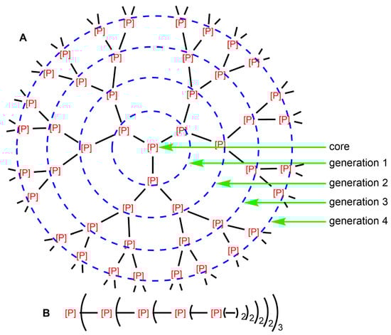 Two types of schematized structure of dendrimers (generation 4) having phosphorus atoms at each branching point, either of type phosphine, or issued from the reaction of phosphines. (A): Full structure; (B): Linear representation of the same dendrimer.