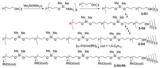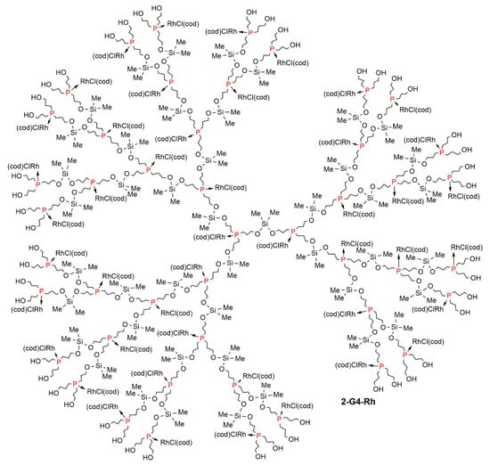 A larger dendrimer was obtained by the controlled addition of tri(hydroxypropyl)phosphine to 3 equivalents of bis(dimethylamino)dimethylsilane. The resulting compound was added to 3 equivalents of tri(hydroxypropyl)phosphine, resulting in the synthesis of the first-generation dendrimer 2-G1. By repeating the sequence of reactions with Me2Si(NMe2)2 and P[(CH2)3OH]3, the second, third, and fourth generations of the dendrimer were prepared (2-G1 to 2-G4). All generations, including the fourth one, reacted with μ-chloro-(1,5-cyclooctadiene)rhodium (I) dimer, [(μ-Cl)(cod)Rh]2 to afford the Rh-complex of the dendrimer 2-G4-Rh shown in Scheme 2 for its linear form and in Figure 2 for the full structure. The same complexes were also obtained by using the complex Rh(cod)(Cl)P[(CH2)3-OH]3 instead of P[(CH2)3OH]3 during the synthesis of the dendrimers. These dendrimer complexes were found efficient catalysts for olefin hydrogenation under standard conditions, using decene as the substrate. The turnover number and frequency were found similar to that of the monomeric complex [9].