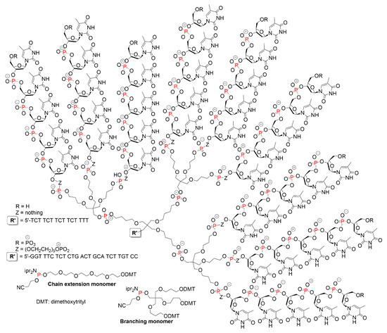 Other types of oligonucleotide dendrimers were synthesized by the same methods, using other phosphoramidite reagents. An example concerned a phosphoramidite functionalized with a pentaerythritol structure, to treble the number of branches at each coupling, and a phosphoramidite functionalized with an oligoethyleneoxide chain to reduce the density of packing. Several dendrimers were synthesized, bearing an oligonucleotide at the core to be used as probe, and nine pentathymidine on the surface (Figure 4). Due to the presence of this long chain oligonucleotide at the core, this compound should be described as a dendron (dendritic wedge) more than a dendrimer. These compounds were used as PCR (polymerase chain reaction) primers. A profound effect on the mobility of the PCR products was observed, as the dendrons decreased the mobility on agarose or polyacrylamide gels [17]. The same concept was then extended to larger compounds bearing up to 27 branches instead of 9, and comprising several types of oligonucleotides as branches. These compounds were associated as complementary pairs both in solution and in the solid state. Duplex stabilities with these dendritic structures were found greater than those observed with unbranched molecules of equal length [18]. Other examples of dendritic structures based on a pentaerythritol phosphoroamidite synthon and having nine antisense oligonucleotides (ODNs) as terminal functions were obtained via automated DNA synthesis. The cellular uptake of ODN-dendrimer conjugates was up to 4-fold greater than naked ODN in cancer cells, and were found effective in inhibiting cancer cell growth [19].