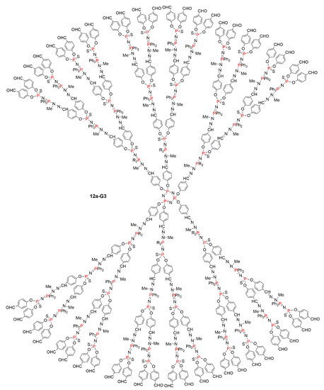 The first series of dendrimers incorporating the P=N-P=S linkage at each generation necessitated three steps to build a new generation. Starting from the aldehyde functions of an hexafunctional cyclotriphosphazene core, the first step was the condensation with methyl hydrazine, which afforded -N(Me)H terminal functions. The second step was the reaction with a chlorophosphine, which generated phosphine terminal functions. Two types of chlorophosphines were used, either diphenylchlorophosphine (a) or a chlorodiazaphospholane (b). The third step was the Staudinger reaction between these phosphines and the thiophosphine azide N3P(S)(OC6H4CHO)2 (CD2), which creates both the P=N-P=S linkages and a new level of branching points. This reaction afforded as terminal functions aldehydes on which the three-step reaction cycle could be repeated (Scheme 12). The synthesis was carried out up to the third generation 12a-G3 (Figure 7) [31].