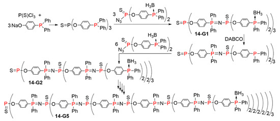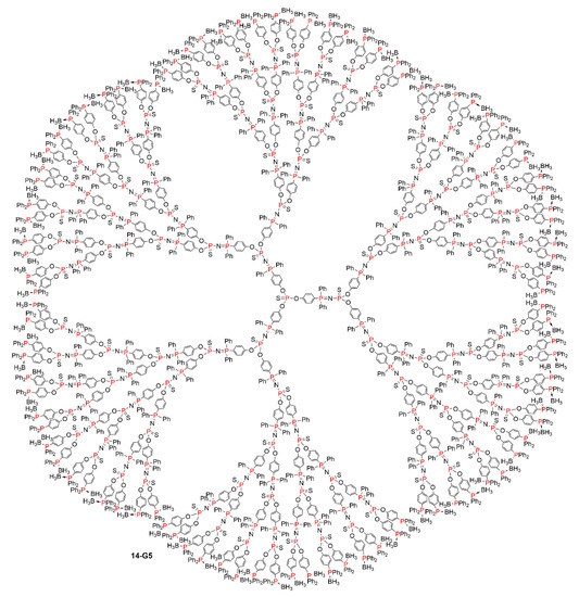 A two-step process using a single branching monomer for the Staudinger reaction was carried out up to the fifth generation. Starting from a triphosphine, the first step was the Staudinger reaction with an azidothiophosphine functionalized with two phosphines protected by BH3. The second step was simply the deprotection of the phosphines using DABCO (1,4-diazabicyclo(2.2.2)octane), to afford free phosphines, ready to react with the same azido monomer, as shown in Scheme 14. The Staudinger reaction and deprotection of the phosphines was carried out up to the synthesis of the fifth generation 14-G5; its full structure is shown in Figure 8. Hyperbranched polymers having a related structure were obtained in a single step by deprotecting the monomer N3P(S)(OC6H4PPh2BH3)2 with DABCO. However, comparison of the physical properties of these hyperbranched polymers and of the corresponding dendrimers, both having analogous molecular weights, pointed out large differences [33].