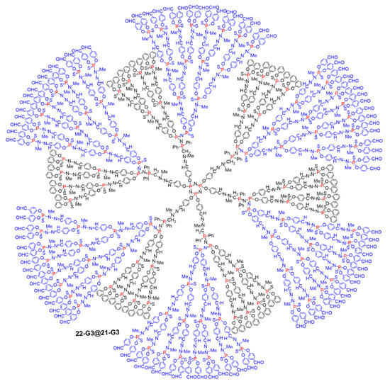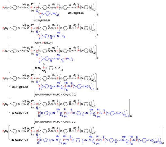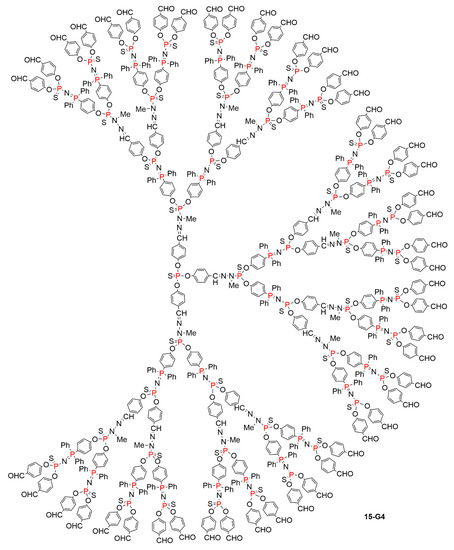 The presence of aldehyde functions inside the structure of dendrimers enabled the growing of new branches from inside, leading to a very sophisticated type of dendritic structure. Two different methods have been used to generate these new branches. One method used the classical way for the synthesis of phosphorus dendrimers [44,45,46] up to the twelfth generation [47], i.e., the condensation of the phosphorhydrazide H2NNMeP(S)Cl2 with the aldehydes, and the substitution of chlorine atoms with hydroxybenzaldehyde in basic conditions. This method was applied for the growing of internal branches up to the third generation, as shown in Scheme 22 and Figure 14 [48].