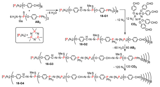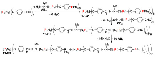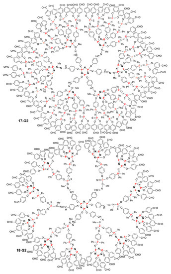 The reaction of the crowded CD5 monomer based on [N3P3] used together with the AB2 monomer was also studied, as shown in Scheme 18. With this large monomer CD5, the phosphazene linkage induced by the Staudinger reaction was stabilized by N3P3 instead of P=S when using the CD2 monomer. The synthesis was also carried out as previously shown up to the fourth generation of the layered dendrimer 18-G4. As in the previous case, the use of the branched monomer CD5 at two steps induced a very large increase of the number of terminal functions. Dendrimer 18-G4 was obtained in four steps. It also bears 600 aldehyde terminal functions, as the dendrimer 17-G4 [39]. Despite their similarity, the families of dendrimers 17 and 18 are intrinsically different, as the crowding due to the highly branched monomers is located in different areas, as illustrated by the comparison between the full structures of dendrimers 17-G2 and 18-G2, both possessing 60 aldehyde terminal functions (Figure 11).