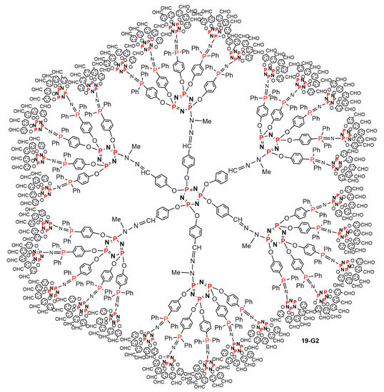 In a final attempt, a dendrimer was synthesized using both crowded monomers AB5 and CD5, both based on the cyclotriphosphazene. The first step was identical to the first step shown in Scheme 17, affording compound 17-G1, functionalized with 30 phosphine terminal functions. The second step was the reaction with the CD5 monomer, affording the second-generation dendrimer 19-G2 functionalized with 150 aldehyde terminal functions. The third step was the reaction with the AB5 monomer, affording the third-generation dendrimer 19-G3 functionalized with 750 phosphine terminal functions (Scheme 19). Due to the very large crowding of this dendrimer, the reaction with the CD5 monomer to get the next generation was not attempted. Figure 12 displays the full structure of the second generation 19-G2. It is not possible to draw the full structure of the third generation, due to very large overlap between the terminal functions in a 2-dimentional representation. There is no other report to date for obtaining so large a number of terminal functions in a dendrimer, using only 3 steps for its synthesis [39].