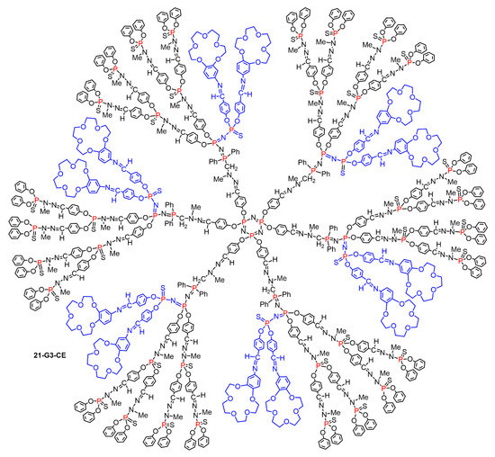 Full structure of the dendrimer 21-G3-CE bearing 12 crown ether derivatives inside its structure.